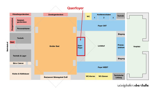 Das Querfoyer ist bei den meisten Veranstaltungen der gastronomischen Versorgung der Besucher vorbehalten. Zwischen den Eingangstüren des Großen Saals sind zwei Kühlhäuser und eine kleine Küche angeordnet. Sie können durch mobile Theken zu einem komplett ausgestatteten Pausenbuffet mit Zapfanlagen und Front-Cooking-Bereich ergänzt werden.