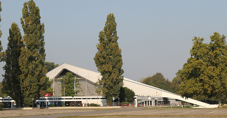 Der Vorplatz ist mit 12 Fahnenmasten bestückt, die die Anbringung von Bannern ermöglichen. Über der Hallenfront befindet sich ein Raster zur Aufnahme großer Spanntransparente. Beide Einrichtungen können von unseren Veranstaltern für Werbezwecke genutzt werden.